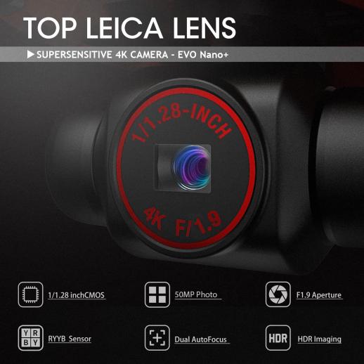 Autel EVO Nano+ on pakattu 1/1,28 tuuman (0,8 tuuman) CMOS-kennoon, joka pystyy 50 megapikselin valokuviin ja 4K/30fps HDR-videoihin. Huomautus: RAW: n suurin tuettu resoluutio on 4096 * 3072
