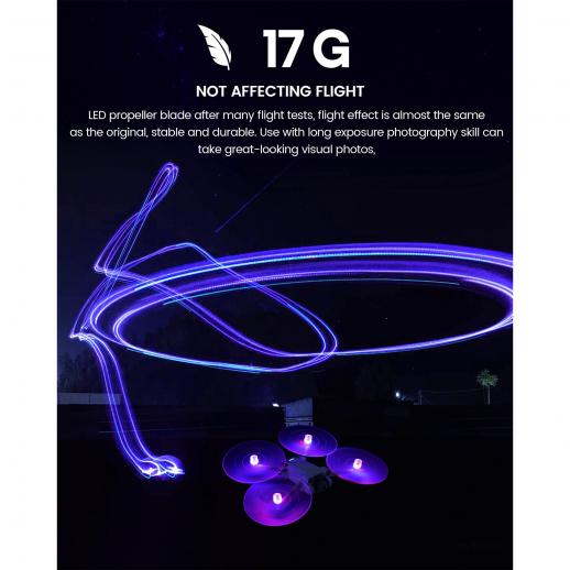 Propeller für rein ästhetische Zwecke. Sie können verwendet werden, um schöne Lightpainting-Effekte zu erzeugen. Es ist zu beachten, dass sie nicht faltbar sind, sodass die Größe der Drohne zunimmt. Sie haben keinen Einfluss auf die Leistung der Drohne