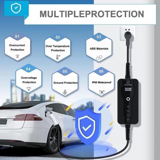 Toimii useimpien sähköautojen kanssa Suojaluokka IP56 – Käyttökunto Ohjauslaatikossa on hienostuneet suojausominaisuudet, voit ladata sen yön yli, mutta pidentääksesi sen käyttöikää, yritä ripustaa se ja säilyttää se sisällä.
