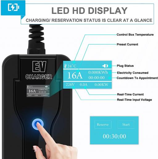 • * Sähköauton laturinäytöllä näyttää virran, jännitteen ja lataustehon.Ohjauslaatikon LED-merkkivalo voi lukea ja kytkeä ajoneuvoon, ladata, ladata kokonaan, ja vianmääritys auttaa tunnistamaan sähköauton laturin käyttötilan.