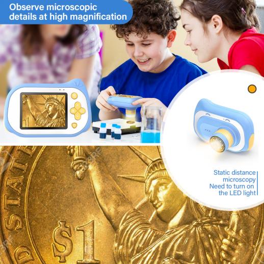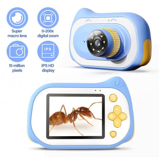 Lasten elektronimikroskooppikamera kaksi-yhdessä, 15 miljoonaa pikseliä, 0-200-kertainen suurennus, 2 tuuman silmiensuojanäyttö, lasten makrokamera DV-videotoiminnolla, sopii lasten ulkohavaintoon ja valokuvaukseen sininen