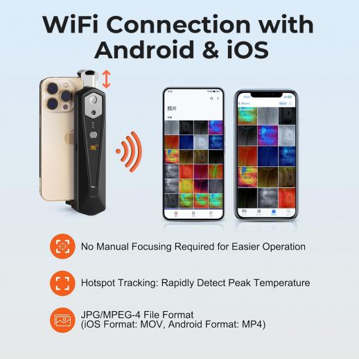 - * 【WiFi-, erillinen näyttö ja kamera】Toisin lisäosat, älypuhelimen kuin lämpökamera muodostaa yhteyden puhelimeen sisäänrakennetun Wi-Fi-yhteyden kautta. Voit vapauttaa kätesi liittämällä sen puhelimeesi tai irrottamalla sen joustavasti tutkimalla vaikeasti saavutettavia alueita samalla kun katsot live-kuvaa puhelimessa. Voit jopa käyttää jopa 2 tuntia omaa 1000 mAh:n akkua – älä enää luota löytää akkuun.