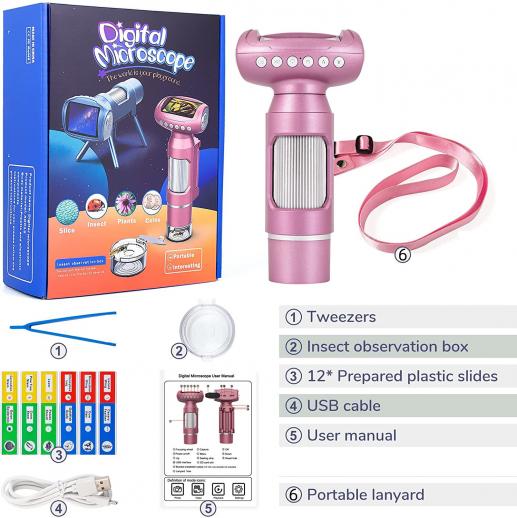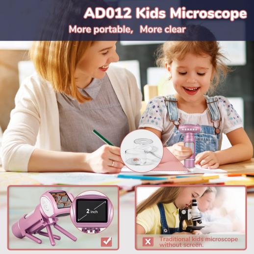 AD012 kannettava lasten mikroskooppi, lasten mikroskooppi 2 tuuman LCD-näytöllä, Windows PC -yhteensopiva opetuslelu, sopii sisäkäyttöön, ulkokäyttöön, ikä 5+ (vaaleanpunainen)