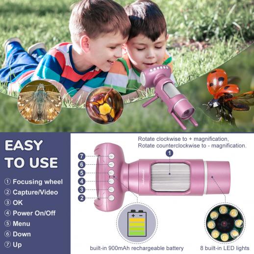 - * 【Ladattava kannettava mikpi】Sisäänrakennettu 900mAh ladattava akku, joten lapset viedä sen minne tarkkailemaan söpöjä eläimiä, kasveja tai retkeilemään, kiipeämään, lisäämään lasten kiinnostusta luontoon;