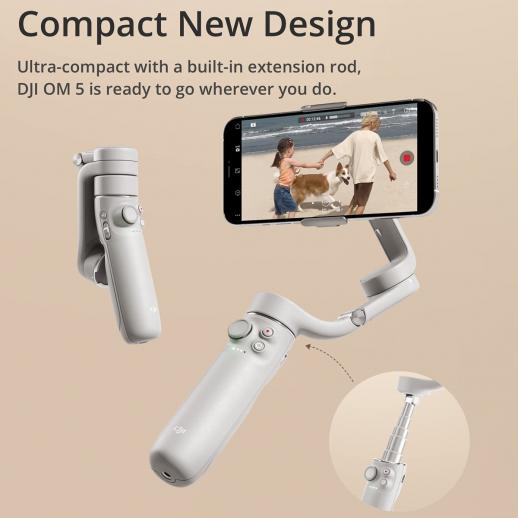 DJI OM 5 Smartphone Gimbal -vakain, 3-akselinen matkapuhelimen karka, sisäänrakennettu jatkotanko, kannettava taitto, Android ja iPhone Gimbal ShotGuidesilla, vloggausvakain, YouTube TikTok -video, harmaa
