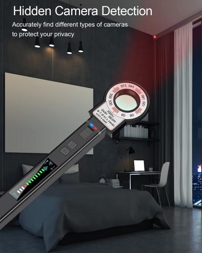 • * 【Yksityisyyden turvallisuus】Tämä piilokameratunnistin voi nopeasti ja tunnistaa salakuuntelulaitteet, reikäkamerat, langalliset ja langattomat piilokamerat, GPS-paikantimet jne. Kameratunnistin voi estää yksityisyytesi vuotamisen;
