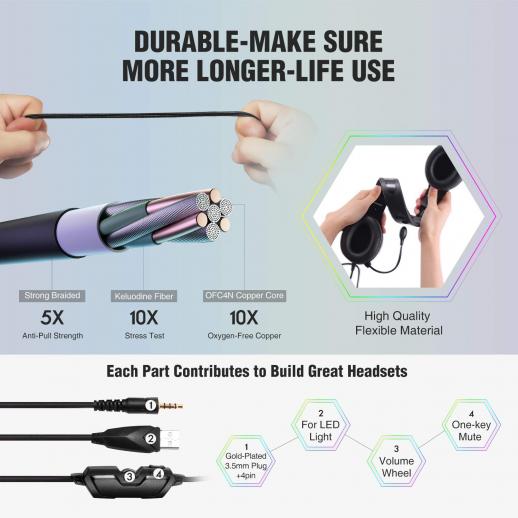 - * Poikkeuksellinen ergonominen muotoilu: Erittäin mukavat, hengittävät proteiinikorvakupit ja monipistetukipääpalkki ovat ergonomisia. Ne vähentävät kuulovammaa ja lämpöä ja hikeä. Ihoystävällinen nahkamateriaali mahdollistaa pidemmän käyttöajan. Korvakuppien häikäisevät LED-valot on suunniteltu korostamaan pelitunnelmaa.