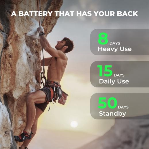 - * Tehokkaan la säästävän älysirun jatkuvan energiaurheilukellomme tarjoaa jopa 8 päivän käytön tarjottavan jatkuvasti tehoa pitkiin ulkoilmaseikkailuihin tai kiireisiin elämäntapoihin. Se on IP68-tason vedenpitävä, turvallinen käsienpesuun, sateeseen, roiskeiluun ja intensiivisiin treeneihin. Yhteensopiva iOS 12.0:n, Android 6.0:n ja uudempien versioiden kanssa.