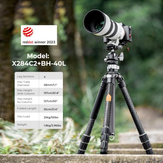 Hiilikuitujalusta ammattimainen kolmijalka 62"/160cm 25kg/55lbs Kantavuus irrotettavalla keskipylväällä ja 40mm metallikuulapäällä SLR DSLR X284C2+