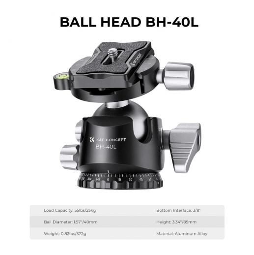 40 mm suuri kuulapää takaa vakauden. Paino on 25 kg, mikä voi kuljettaa suurempia ja raskaampia kuvauslaitteita.