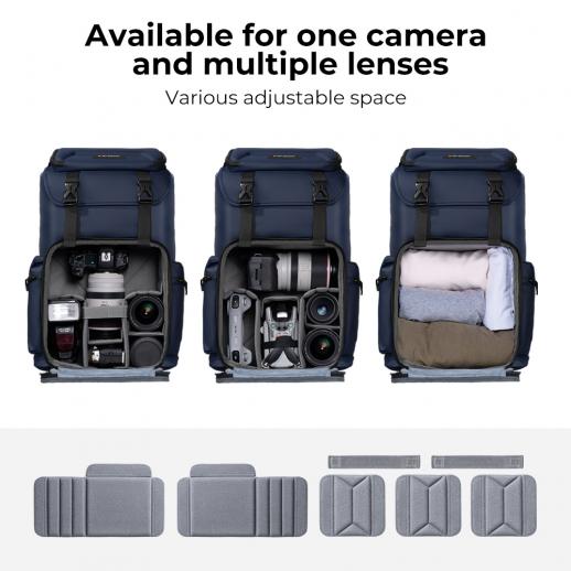 - * Ammattimaisena ulkokameralaukkuna tilavuus on 22L, ylempi ja alempi säilytyslokero, yksi kamera, jossa on useita linssejä, etuaukko.