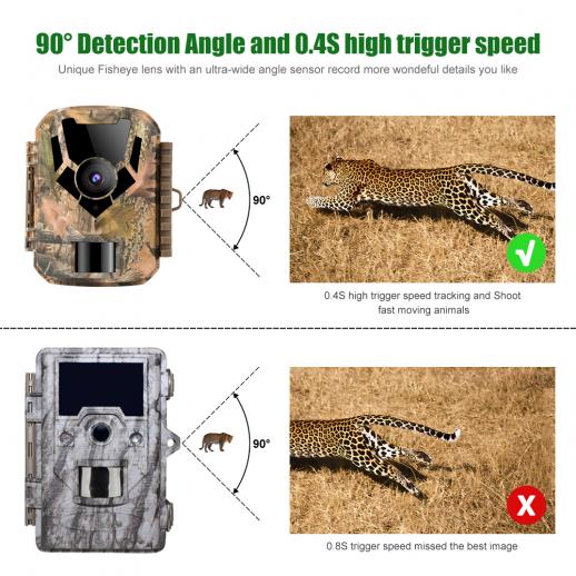 - * 【Nopea liipaisinnopeus pitkä työaika】 Polkukamerassamme on vaikuttava 0.4 sekunnin laukaisunopeus, jonka avulla se voi tallentaa havaitsemispaikkojen jokaisen jännittävän hetken. Lisäksi kameralla on uskomattoman pitkä valmiusaika, jopa 3 kuukautta, kun se saa virtansa 4 AA-paristosta, ja vielä pidempi, kun se liitetään aurinkopaneeliin (ei sisälly toimitukseen).