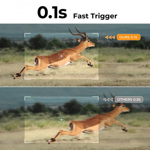 - * 【0,2S laukaisunopeus ja 2S PIR-väli】Kun PIR-anturi havaitsee liikkeen, K&F CONCEPT Wildlife Camera laukeaa välittömästi 0,2 sekunnissa. Ja PIR-väli voidaan asettaa lyhimmäksi 2 sekunniksi (useimmat polkukamerat voidaan asettaa vain lyhimmäksi 5 sekuntiin). Joten et enää koskaan menetä yhtään jännittävää hetkeä.