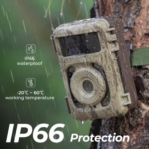 - * 【Säädettävä kulma ja vahva vedenpitävä suorituskyky】 Mukana huippuluokan kulmassa säädettävä kiinnike, jonka ansiosta kameran kulma on 45° ja asennus on vakaampi; se käyttää IP66 vedenpitävää, pölynkestävää ja pudotusta kestävää kuorta, joka kestää -10°C ~ 50°C ℃ autiomaassa tai trooppisessa sademetsässä ja muissa ankarissa työympäristöissä. Ihanteellinen ulkona villieläinten seurantaan.