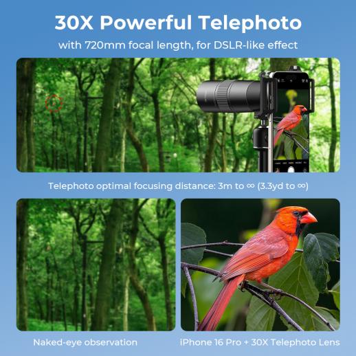- * 【30X Zoom Power, Muuta puhelimesi järjestelmäkameraksi vähemmällä hinnalla】Vapauta 30X super suurennus 720 mm:n polttovälin avulla – joka tarkennusrengaksen arvolla kierrolla voit helposti tallentaa kotkan lentoja, kuukraattereita tai näyttämään terävöittäjiä taustaa ja häivytyksiä leukaa pudottavilla yksityiskohdilla, luoden syviä kilometrien tarkennettua kohdetta.