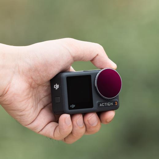 Kuten muidenkin kameroiden kanssa, sinun tulisi käyttää Osmo Action 3:n kanssa suodattimia parhaan mahdollisen kuvanlaadun saavuttamiseksi. Suodattimien vaihtamiseksi poista alkuperäinen objektiivin suojus ja ruuvaa haluamasi suodatin kiinni. Suodattimen reuna on uurrettu hyvän otteen takaamiseksi. Jokainen suodatin on merkitty sen nimellä valkoisilla kirjaimilla reunaa pitkin. Yhteenveto: Erittäin kestävät ja laadukkaat suodtimet.