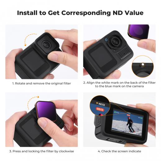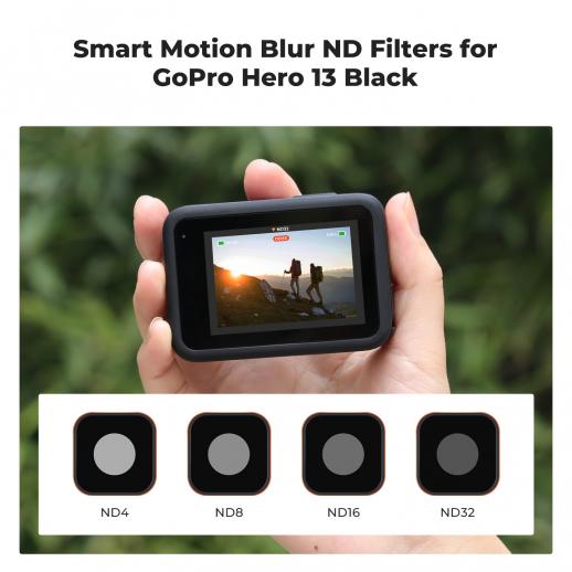 - * 【Älykäs suodattimen tunnistus】Neljässä ND-suodattimessa on sisäänrakennetut tunnistustoiminnot, jotka suosittelevat automaattisesti sopivia suodattimia valaistusolosuhteiden perusteella (saatavilla vain GoPro 13:ssa). Huomautus: Nämä suodattimet ovat yhteensopivia myös GoPro Hero 12/11/10/9 Black -kameroiden kanssa, mutta niissä ei ole älykästä tunnistusta.