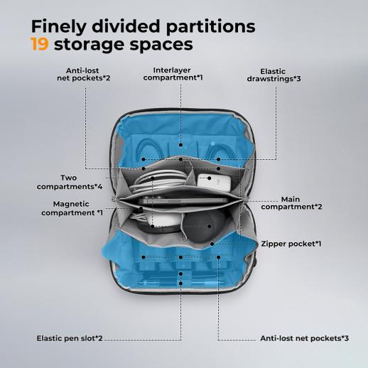 - * 【Lisävarusteiden suojaus】Pehmeä sisävuori ja turvallinen muotoilu suojaavat digitaalisia lisävarusteita puristumiselta, iskuilta ja muilta mahdollisilta vaurioilta.